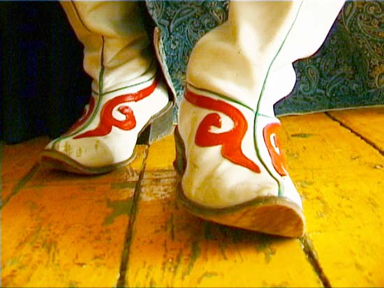Je les trouve magnifiques, ces bottes mongoles. Même le Père Noël n'en n'a pas d'aussi belles... Celles-là appartiennent à la chanteuse photographiée (et enregistrée) au début du Carnet de Bord Mongolie. Mongolie, Oulan Bator, juillet 2000