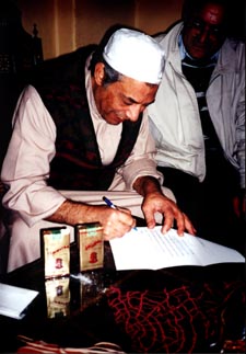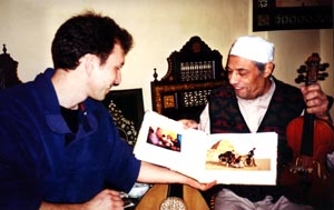 Xavier a profité d'un passage au Caire, en mars 2002, pour rencontrer Abdu Dagher. Après un petit coup de fil pour établir à nouveau le contact, Xavier a pu rencontrer LE violoniste chez lui, comme deux années plus tôt. Il lui a présenté et offert le livre, ainsi que l'enveloppe prévue. Manifestement, Abdu Dagher ne s'y attendait pas du tout; c'était l'occasion de lui réexpliquer l'objectif de cette démarche: établir une vraie relation avec les musiciens rencontrés sur notre route, reconnaître et valoriser le patrimoine musical. (Pas facile quand on a oublié ses bribes de connaissances d'arabe depuis de nombreux mois !)