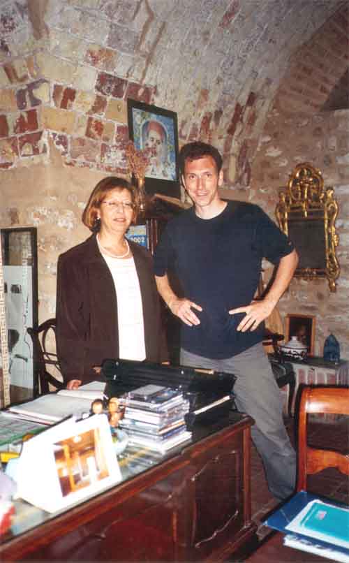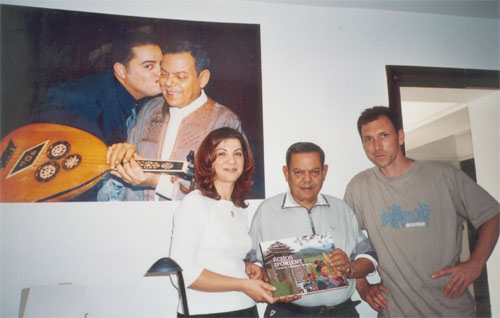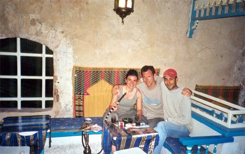 Vous vous souvenez de Dar Sellami ? Une cérémonie purement traditionnelle qui nous a rendu <<complètement dingues à Sfax : une "takhmira" (fichier MP3, 985 KB) , soirée de transe de la confrérie soufie Awamria. Dans la rue, la nuit tombée, un coup de canon annonce le sacrifice...>>. Reportez vous au carnet de bord de Tunisie pour en savoir plus. Ci-dessus, vous retrouvez Bacem Sellami (de la maison Dar Sellami où s'est déroulée cette soirée de transes soufi). Bacem travaille activement à la conservation et la restauration des maisons de la Medina (la vieille ville) de Sfax. Bacem, donc, nous a donné RV à Tunis, pour recevoir le livre et l'encouragement financier de la SACEM; son neveu Ahmed, ci-dessous avait passé du temps en 1999 avec Isabelle et moi pour nous expliquer ce qu'on ressent quand on est en transes, auprès d'Allah.