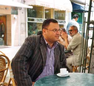 Vous vous souvenez de Dar Sellami ? Une cérémonie purement traditionnelle qui nous a rendu <<complètement dingues à Sfax : une "takhmira" (fichier MP3, 985 KB) , soirée de transe de la confrérie soufie Awamria. Dans la rue, la nuit tombée, un coup de canon annonce le sacrifice...>>. Reportez vous au carnet de bord de Tunisie pour en savoir plus. Ci-dessus, vous retrouvez Bacem Sellami (de la maison Dar Sellami où s'est déroulée cette soirée de transes soufi). Bacem travaille activement à la conservation et la restauration des maisons de la Medina (la vieille ville) de Sfax. Bacem, donc, nous a donné RV à Tunis, pour recevoir le livre et l'encouragement financier de la SACEM; son neveu Ahmed, ci-dessous avait passé du temps en 1999 avec Isabelle et moi pour nous expliquer ce qu'on ressent quand on est en transes, auprès d'Allah.